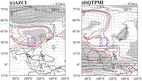 Regressions of 700 hPa geopotential height and winds onto standardized monsoon indices: (a) EASMI; (b) SASMI; (c) AZCI; (d) QTPMI. The vector is the horizontal wind field (m/s), the thick black contour indicates the zero-regression coefficient of potential height, the red thick contour line indicates the positive regression coefficient for the potential height, the purple dashed box shows the West China region, and the black dots indicate that the significance test was passed with a 95% confidence level.