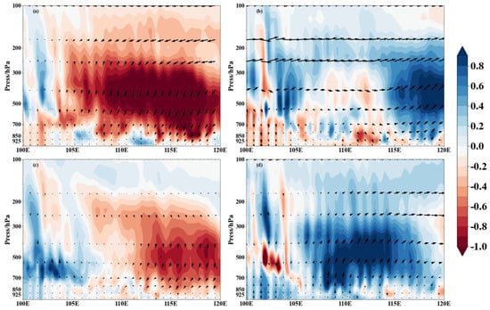 Vertical velocity (shaded, Pa/s) and latitudinal circulation (arrows) distance level (m/s) profiles (for each monsoon combination minus the multi-year average) averaged over 25−36° N for different configurations of EASM and SASM in different years: (a) strong EASM and strong SASM; (b) weak EASM and weak SASM; (c) strong EASM and weak SASM; (d) weak EASM and strong SASM.