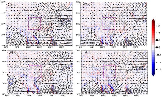 The 850 hPa water vapor flux dispersion (kg/m·hPa·s) and the wind field distance level (m/s) (for each monsoon combination minus the multi-year average) for different configurations of EASM and SASM in different years: (a) strong EASM and strong SASM; (b) weak EASM and weak SASM; (c) strong EASM and weak SASM; (d) weak EASM and strong SASM. The dashed box represents the WCAP area.