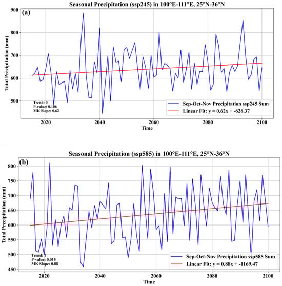 Future WCAP trends (2015–2100) simulated by the MIROC6 model under different scenarios: (a) SSP2–4.5 scenario; (b) SSP5–8.5 scenario. The red line represents the trend line derived from the M-K test.