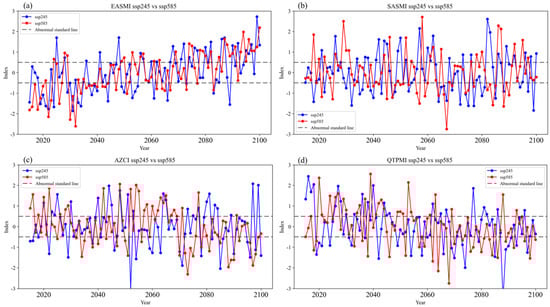 Predicted monsoon indices under different future scenarios (2015–2100) simulated by the MIROC6 model: (a) EASMI; (b) SASMI; (c) AZCI; (d) QTPMI.