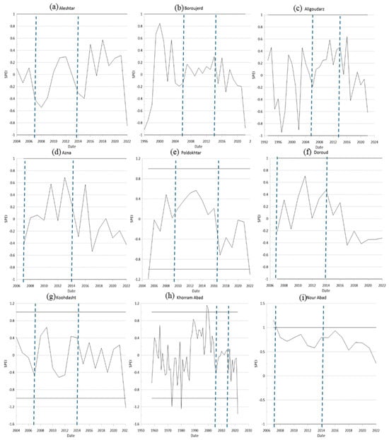 The trend charts for the SPEI in both regions are shown in Figure 5 and Figure 6, which align with the Z-statistic results. In Lorestan (Figure 8), a sharp rise in drought trends occurred in Aleshtar (2006, 2010, and 2016); Doroud (2014); Khorram Abad (1991); Koohdasht (2009, 2013, and 2018); and Nourabad (2012, 2014, and 2016). A sharp drop in trends of SPEI were observed in Aleshtar (2007), Khorramabad (2015), Koohdasht (2018), and Nourabad (2013 and 2020). These abrupt changes significantly influenced the overall drought trends during the study period.