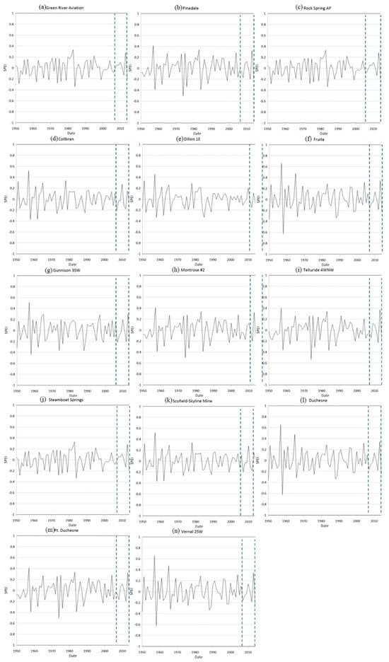 Time series of monthly SPEI in Green and Bear Drainage, Colorado Drainage Basin, Uinta Basin, and Northern Mountains in UCRB. (a) Green River Aviation, (b) Pinedale, (c) Rock Springs AP, (d) Collbran, (e) Dillon 1E, (f) Fruita, (g) Gunnison 3SW, (h) Montrose #2, (i) Telluride 4WNW, (j) Steamboat Springs, (k) Scofield-Skyline Mine, (l) Duchesne, (m) Ft. Duchesne, (n) Vernal 2SW; The dashed line marks the common time period between Lorestan and Colorado.