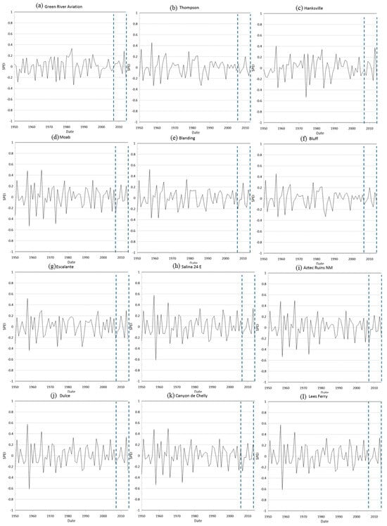 Time series of monthly SPEI in southeast, south central, and northwestern plateau and northeast in UCR3.3. Comparison of the Common Period (2007–2014). (a) Green River Aviation, (b) Thompson, (c) Hanksville, (d) Moab, (e) Blanding, (f) Bluff, (g) Escalante, (h) Salina 24 E, (i) Aztec Ruins NM, (j) Dulce, (k) Canyon de Chelly, (l) Lees Ferry; The dashed line marks the common time period between Lorestan and Colorado.