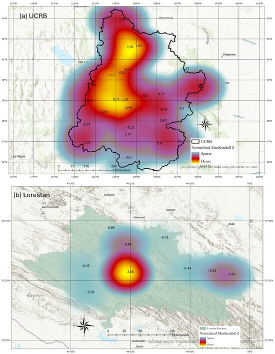 Spatial distribution analysis of the Mann–Kendall Z-values and heatmaps of normalized Mann–Kendall Z-values in (a) UCRB and (b) Lorestan.