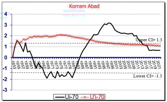 In Lorestan, the Khorramabad station exhibited a statistically significant increasing trend in drought conditions. The computed Z-value of 3.66 exceeds the critical threshold of 2.57, indicating a highly significant trend at the 99% confidence level. This finding was further supported by a confidence band analysis, which revealed that the observed Z-value lies well above the upper limit (±1.33), as shown in Figure 7. The strong upward trend at Khorramabad may be attributed to its location within a cold wet climate zone and its status as the station with the highest annual mean precipitation in the province.