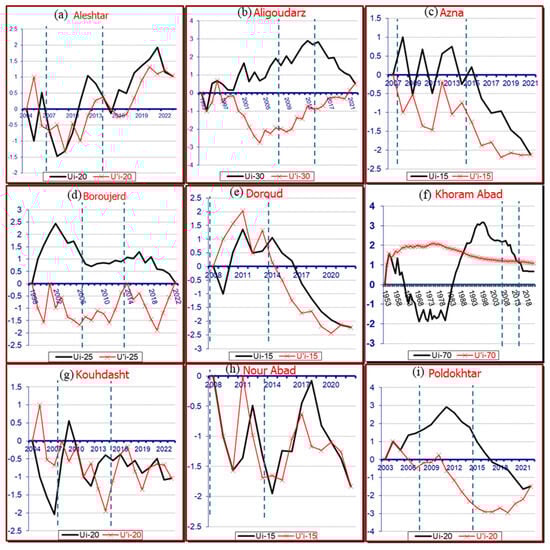 Mann–Kendall graph for monthly SPEI in Lorestan. (a) Aleshtar, (b) Aligoudarz, (c) Azna, (d) Boroujerd, (e) Doroud, (f) Khorram Abad, (g) Koohdasht, (h) Nour Abad, (i) Poldokhtar; The dashed line marks the common time period between Lorestan and Colorado.