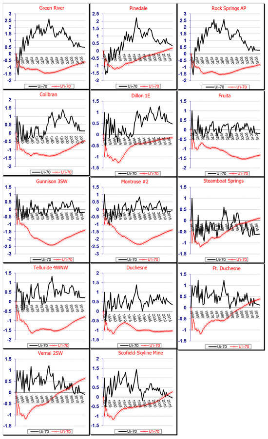 In the UCRB (Figure 9 and Figure 10), a sharp drop occurred in Steamboat Springs (2000), which corresponded to a period of severe droughts across the western United States, attributed to La Nina-induced precipitation deficits, Ft. Duchesne (2008 and 2012), and Salina 24 E (2011). Sudden spikes were observed in Green River (1954), Pinedale (1955), and Rock Springs AP (1954). The wet anomalies in Green River and Pinedale align with documented El Nino events that brought above-average precipitation to the region. These significant fluctuations highlight the role of precipitation and temperature changes in drought variability across the UCRB.