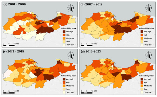 | Vulnerability | V1: (NDVI) Normalized difference vegetation index | An index used to measure the density of vegetation | (−) | [37,40] | |