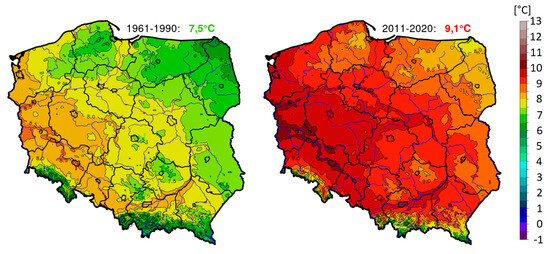 Maps of air temperature change in Poland (source: naukaoklimacie.pl, elaboration: Piotr Djaków, based on IMGW-PIB data).