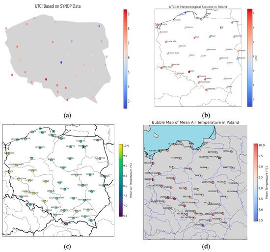 Maps of mean annual UTCI (a,b) and air temperature (c) created by ChatGPT4.0 and 4.o. Map (a) was created in February 2024 by ChatGPT4.0; map (b) in June 2024; map (c) in September 2024 (both by ChatGPT4.o); map (d) in February 2025 by ScholarGPT. Prompt: This is the file with the names of meteorological stations in Poland, their longitude and latitude and mean air temperature. Can you draw a bubble map of Poland based on ‘MEAN’ column? Add a legend to the map and names of the stations below the points.