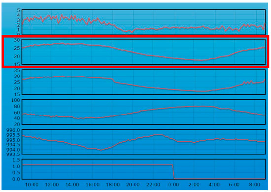 Meteorological parameters during 18–19 July 2024 in Lublin, Poland (from above: wind speed [m/s], air temperature [°C], heat index [°C], relative humidity [%], station level pressure [hPa], precipitation [mm]). The Air temperature chart, used for the study, is marked with red box. Prompt: This is the chart of some meteorological data. The second chart from the top is air temperature in degrees Celsius in days 18–19 July 2024. At the bottom you have axis with the hours. Can you give me exact values of the air temperature for each hour? Start with 10.00, than 11.00 and end with 8:00.