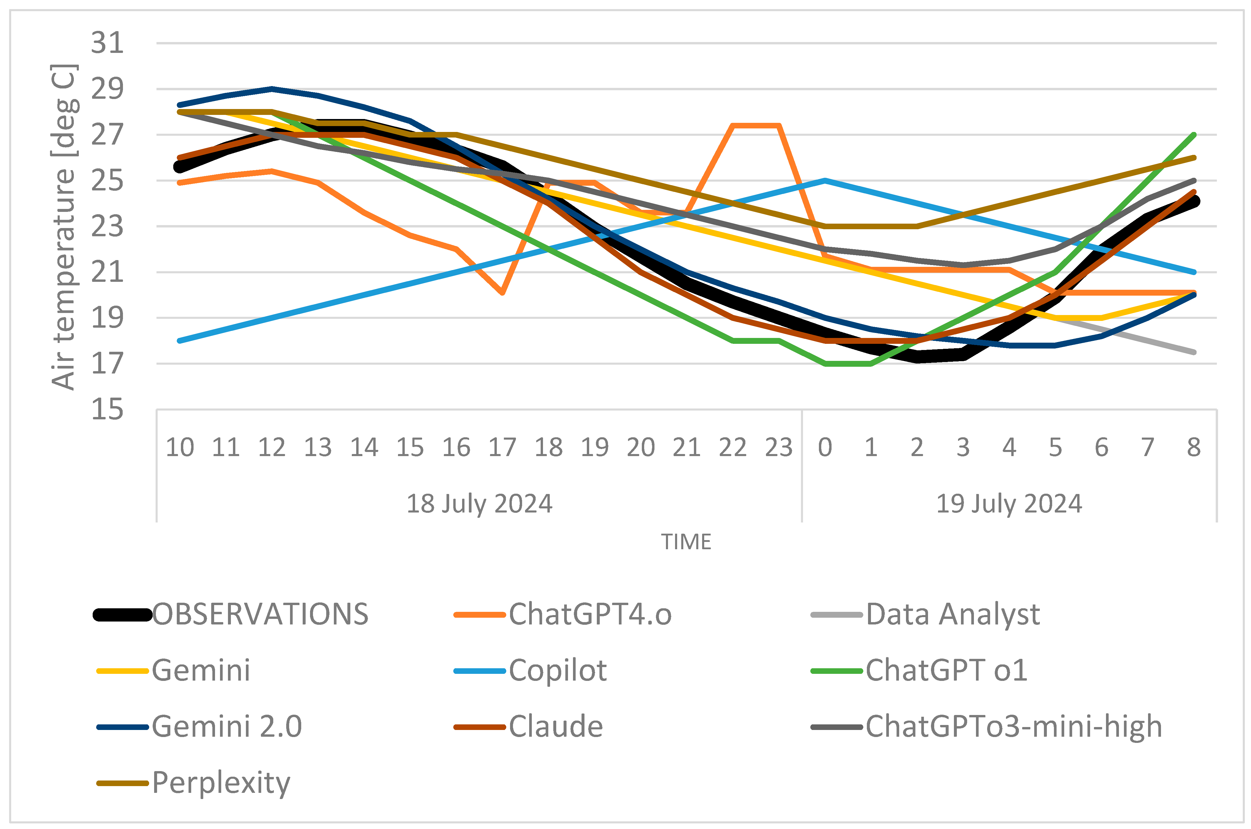 In Figure 4, a screen capture from our University website displays the current weather in the city center of Lublin, southeastern Poland. The second chart from the top depicts the air temperature over the period 18–19 July 2024. This chart was saved as a standard graphical file and was uploaded to several LLMs capable of processing images, including ChatGPT 4.o, Gemini, Copilot, and DataAnalyst. Later, in February 2025, additional models—namely ChatGPT o3-mini-high, Claude 3.5 Sonnet, PerplexityAI, Consensus, and SciSpace—also processed the file.