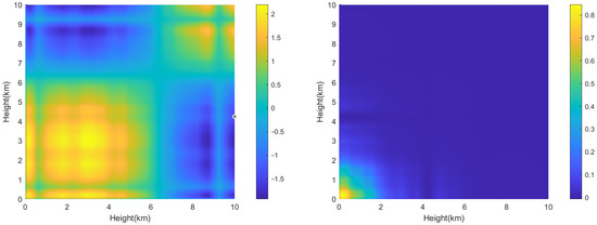 Figure 2 shows the background error covariance of temperature and water vapor density. Both the abscissa and ordinate axis represent altitude from the surface up to 10 km. The background error covariance matrix (B) comprises a -dimensional matrix. The elements within the matrix represent the error covariances between the NCEP reanalysis data and the radiosonde data (true atmospheric state) at various altitudes. As shown in Figure 2, the temperature error covariance matrix presents a large covariance near the diagonal, especially within the 0 to 5 km altitude range, while the water vapor density background error covariance matrix exhibits large covariance at the lower altitude levels. Above 2 km, the low water vapor content results in smaller covariances for the water vapor density.
