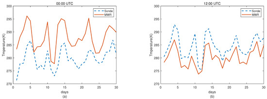 Comparison of surface observations from radiosonde and MWR at 00:00 and 12:00. (a) 00:00 UTC comparison (daytime); (b) 12:00 UTC comparison (nighttime).