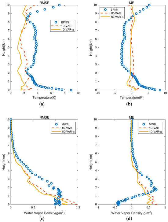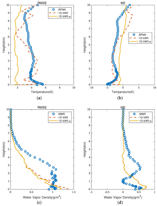Comparison of improved 1D-VAR (1D-VAR-,), 1D-VAR and BPNN retrieval methods during daytime. (a) RMSerrors of temperature. (b) Mean errors of temperature. (c) RMSerrors of water vapor density. (d) Mean errors of water vapor density.