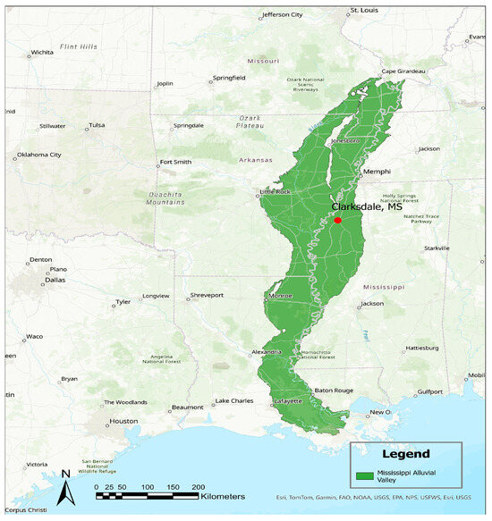 Approximate boundaries of the Lower Mississippi River Valley in the United States. The red dot indicates the approximate location of the study area. Map created with ArcGIS software (version 2024, ESRI, Redlands, CA, USA).