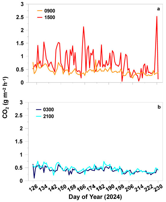 Carbon dioxide (CO2) fluxes among measurement times of day [i.e., 0900 and 1500 (panel (a)) and 0300 and 2100 (panel (b)) hours] over time during the 2024 corn growing season at the Vayda Regenerative Farm near Clarksdale, MS. The standard error extracted from Tukey’s mean separation analysis was 0.09 g m−2 h−1.