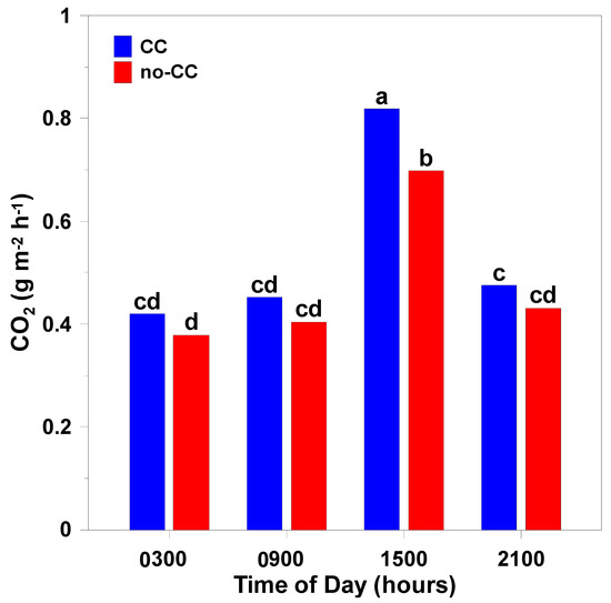 Averaged across measurement dates, the greatest CO2 flux occurred from CC at 1500 h, while the lowest CO2 flux was from no-CC at 0300 h, which did not differ from CO2 fluxes from CC at 0300, CC and no-CC at 0900, and no-CC at 2100 h (Figure 3). The lowest CO2 flux was also lower (p < 0.05) than from CC at 2100 and no-CC at 1500 h, which also differed (p < 0.05) from each other (Figure 3). Carbon dioxide fluxes only differed between CC treatment at 1500 h but were unaffected (p > 0.05) by CC treatment at 0300, 0900, and 2100 h. However, at all measurement times, CO2 fluxes were at least numerically greater from CC than no-CC (Figure 3).