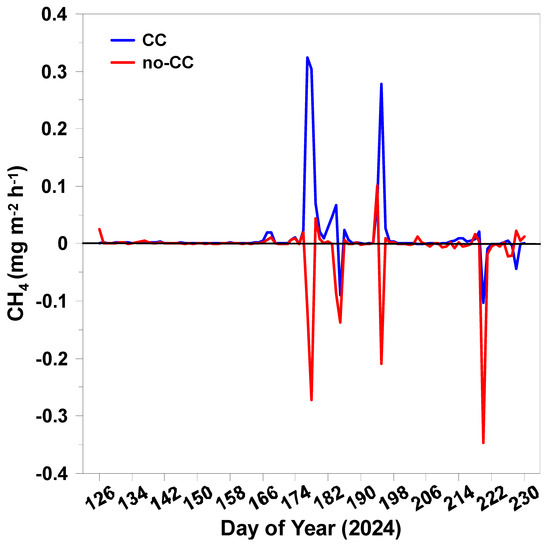 Methane (CH4) fluxes among cover crop treatments [i.e., cover crop (CC) and no cover crop (no-CC)] over time during the 2024 corn growing season at the Vayda Regenerative Farm near Clarksdale, MS. The standard error extracted from Tukey’s mean separation analysis was 0.11 mg m−2 h−1.