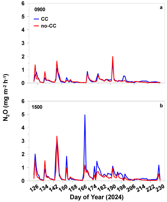 Daytime nitrous oxide (N2O) fluxes among cover crop treatments [i.e., cover crop (CC) and no cover crop (no-CC)] and measurement time of day [i.e., 0900 (panel (a)) and 1500 (panel (b)) hours] combinations over time during the 2024 corn growing season at the Vayda Regenerative Farm near Clarksdale, MS. The standard error extracted from Tukey’s mean separation analysis was 0.22 mg m−2 h−1.