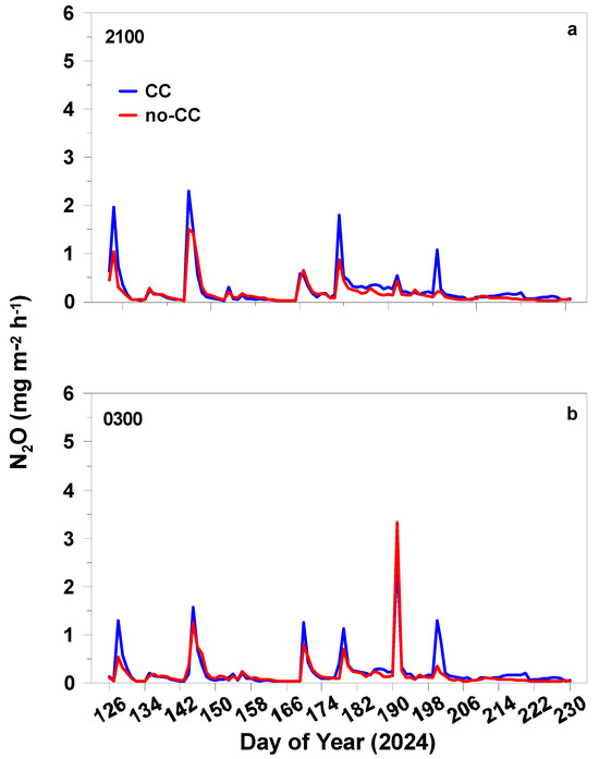Among all treatment combinations, >20% of measured N2O fluxes from CC (i.e., 14 dates for 0300 and 0900, 41 dates for 1500, and 16 dates for 2100 h) and almost 13% (i.e., 10 dates at 0300, 11 dates at 0900, 22 dates at 1500, and 11 dates at 2100 h) from no-CC were greater (p < 0.05) than a flux of zero (Figure 5a,b and Figure 6a,b). The largest mean N2O flux was recorded on DOY 168 (i.e., 16 June) at 1500 h under CC (4.9 mg m−1 h−1), which did not differ (p > 0.05) from the flux on DOY 145 (i.e., 24 May) at 1500 h under no-CC (3.8 mg m−1 h−1, Figure 5b).