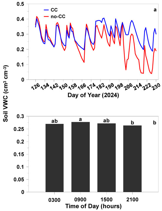 Soil volumetric water content (VWC) measured in the top 6 cm, average across measurement times of day, between cover crop treatments [i.e., cover crop (CC) and no cover crop (no-CC)] over time (panel (a)) and among measurement times of day (i.e., 0300, 0900, 1500, and 2100 h) averaged across measurement dates and CC treatments (panel (b)) during the 2024 corn growing season at the Vayda Regenerative Farm near Clarksdale, MS. For the top panel, the standard error extracted from Tukey’s mean separation analysis was 0.02 cm3 cm−3. For the bottom panel, different letters on top of bars denote a significant difference at the 0.05 level.