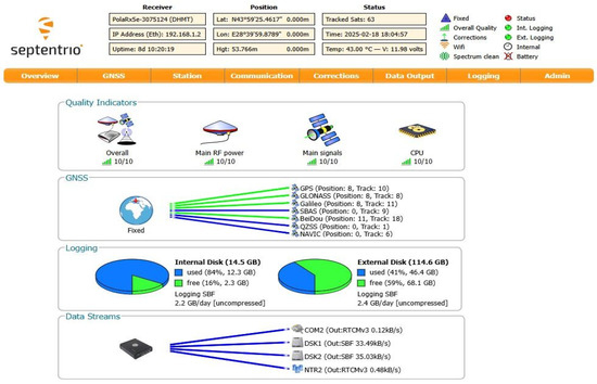 Figure 3 shows the receiver’s web interface, which provides information on receiver status, satellite tracking, and logging. The system is configured to log raw data for post-processing and real-time interference analysis.