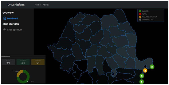 By implementing software components for DHM stations (receivers), the GNSS spectra recorded at their locations can be monitored in real-time, with alarm notifications sent to the user. Thus, the GNSS signal monitoring application can detect real-time interference in the following frequency bands with a bandwidth of 60 MHz: L5—1188 MHz, L2—1231 MHz, E6—1275 MHz, L1—1584 MHz.