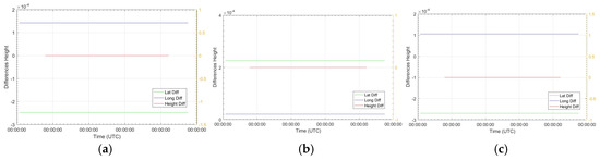 The time series analysis presented in Figure 6 highlights a key characteristic: the near-constant nature of deviations in latitude, longitude, and height during the seven-day observation period. As shown, the offsets in each coordinate component display minimal temporal variation within this time frame, further supporting the interpretation that predominantly systematic errors occurred during this interval. This observation indicates that the discrepancies detailed in Figure 6 do not indicate transient interference phenomena such as jamming, which would typically manifest as increased signal variability or noise. Instead, these persistent biases likely originate from factors affecting the inherent accuracy of the GNSS solutions.