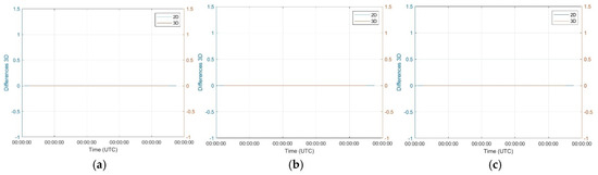 Figure 7a–c illustrates the temporal variation in 2D and 3D differences from the mean value for the GNSS measurements at the specified stations. A consistent observation across all three stations is the absence of any deviation from the mean for both 2D and 3D representations. Throughout the observed time span, both the 2D and 3D difference values remain precisely at zero, indicating that the measurements exhibit no displacement or offset from the calculated average. This suggests high stability and agreement with the mean value in the data’s horizontal and three-dimensional components.