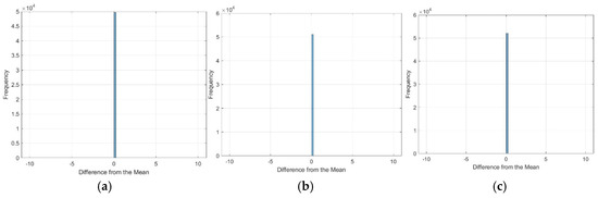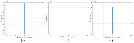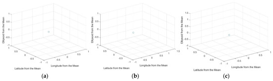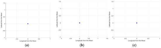Figure 8 presents the deviations in latitude and longitude from their respective mean values for the GNSS measurements. A striking consistency is observed across all three subplots (Figure 8a–c): the data points are concentrated precisely at the origin of the coordinate system. This indicates that the measured values exhibit no displacement from the calculated average for latitude and longitude. In other words, within the resolution of this analysis, the GNSS positions align perfectly with the mean position over the observation period at each station.