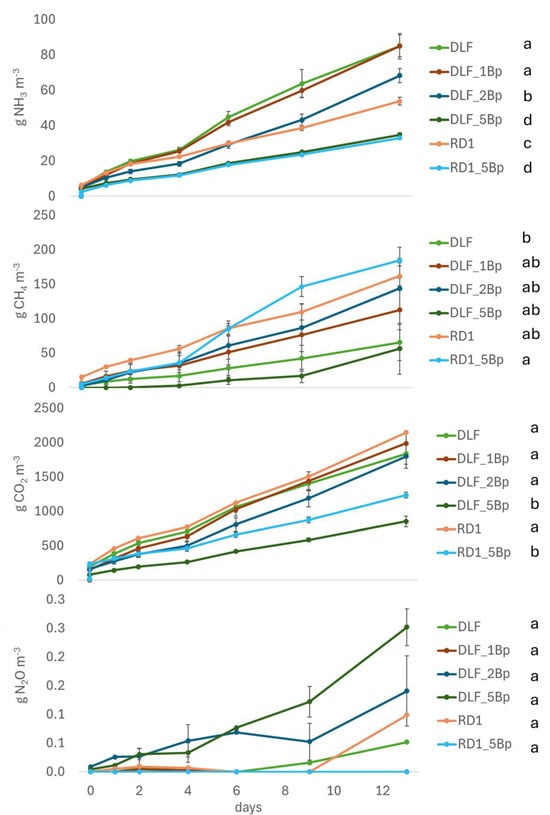 Cumulative emissions of NH3, CH4, CO2 and N2O (from top to bottom) measured in incubation 1. Standard errors are reported for each measurement day. Different letters indicate significant differences between treatments at p < 0.05 (repeated ANOVA). According to Table 2, RD: Raw digestate; DLF: Digestate liquid fraction; 1Bp, 2Bp, 3Bp: cover layer (cm) of biochar from pyrolysis.