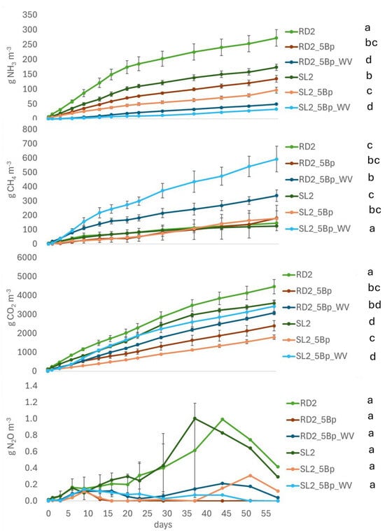 Cumulative emissions of NH3, CH4, CO2 and N2O (from top to bottom) measured in incubation 2. Standard errors are reported for each measurement day. Different letters indicate significant differences between treatments at p < 0.05 (repeated ANOVA). According to Table 3, RD: Raw digestate; SL: Slurry; 5Bp: 5 cm biochar from pyrolysis; WV: Wood vinegar.