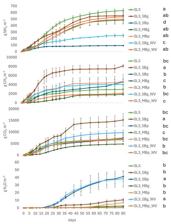 Cumulative emissions of NH3, CH4, CO2 and N2O (from top to bottom) measured in incubation 3. Standard errors are reported for each measurement day. Different letters indicate significant differences between treatments at p < 0.05 (repeated ANOVA). According to Table 4, SL: Slurry; Bp: 5 cm biochar from pyrolysis: Bg: biochar from gasification; 5B: 5 cm biochar cover; MB: Biochar mixed; WV: Wood vinegar.