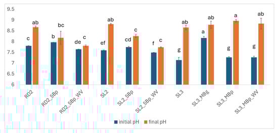 The pH of the tested by-products followed the order: DLF > RD > SL SL used in incubation 3 had significantly lower pH compared to SL used in incubation 2 (Table 1 and Table 4). At the start of the incubations, biochar cover increased the pH of RD and SL, while mixed biochar only increased pH when derived from gasification (Figure 4). pH was significantly lower at the beginning of incubation in RD and SL treated with wood vinegar, but no significant difference was observed at the end of the incubation (Figure 4).