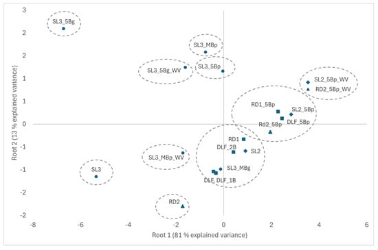 Discriminant function analysis using NH3, CH4 and CO2 cumulative emissions of the three incubations at 14 days as independent variables. Explained variance of Root 1 and 2 is reported in the figure. Squared Mahalanobis distances are represented by dotted circles, indicating significant differences among treatments when not overlapping (p < 0.05).