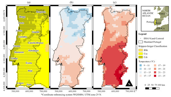 (a) Spatial distribution of the 1012 ERA5-Land centroids, represented by bullets, analysed within mainland Portugal (89,015), with Köppen-Geiger climate classification. (b) Average of daily mean temperature, , and (c) average of daily maximum temperature, , both calculated for the global 44-year period from 1 October 1980 to 30 September 2024.