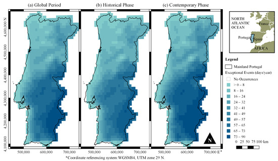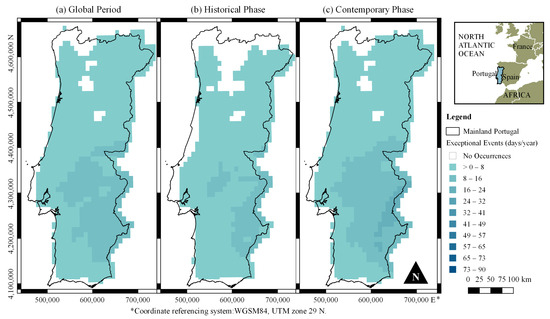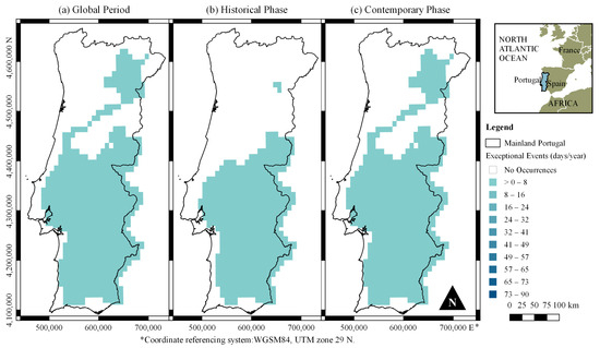 Figure 2, Figure 3 and Figure 4 illustrate the spatial distribution of the annual average of Occurrence of Exceptional Tmax Events (OTE) across mainland Portugal for the three distinct temperature thresholds: Q, Q, and Q, respectively. Each figure presents results for the global period (1980/1981 to 2023/2024), the historical phase (1980/1981 to 2001/2002), and the contemporary phase (2002/2003 to 2023/2024). In calculating these annual averages, years with no exceedances were assigned a value of 0 days/year, ensuring comprehensive representation of exceptional event frequency. As expected, the frequency of OTE is inversely related to the temperature threshold across all periods. For the Q90 threshold (Figure 2), annual averages of OTE ranged from 0 to 90 days/year in the global period. The highest values were concentrated in the Alentejo region, specifically around Portalegre, Évora, and Beja. This pattern is consistent with Portugal’s established climatic trends, where southern and interior regions typically experience higher average temperatures. The historical phase (Figure 2b) showed similar spatial patterns but with generally lower frequencies. The contemporary phase (Figure 2c) exhibited a notable increase in OTE compared to the historical phase, particularly in the Alentejo region.