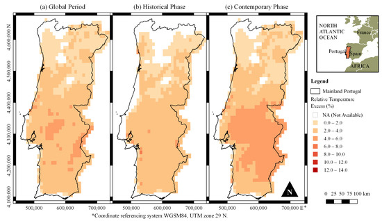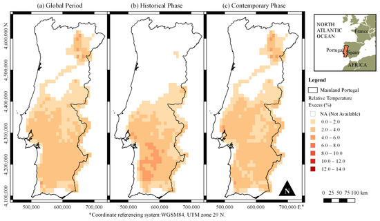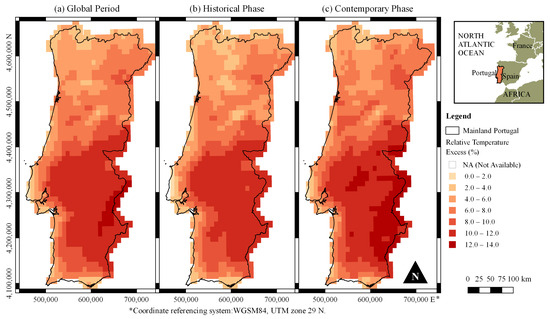 3.2. Spatial Distribution of Relative Temperature Excess in Portugal
