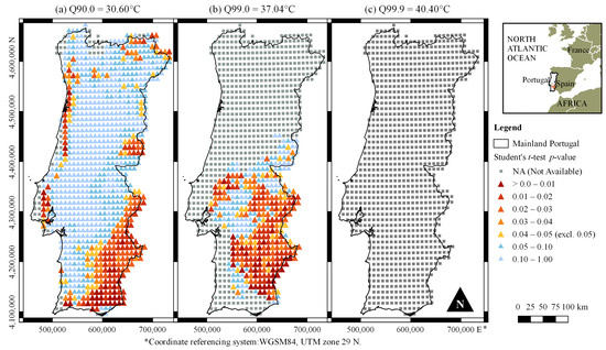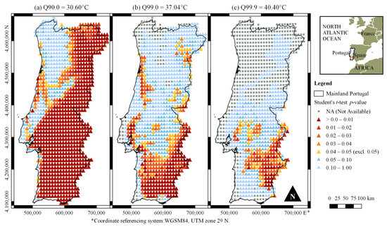 For OTE at Q90 (Figure 8a), very small p-values (<) were concentrated in southern Portugal, particularly in the Algarve and Alentejo, extending northwards along the eastern regions of Lisbon and further into central and northern Portugal. The statistical significance diminishes for higher thresholds: Q99 (Figure 8b) shows low p-values in Alentejo, Algarve, and some parts of Lisbon, while for Q99.9 (Figure 8c), significant changes in OTE were mostly confined to southeastern Portugal and isolated locations near Lisbon. The statistical difference analysis for RTE (Figure 9) reveals similar patterns to those observed for OTE. For Q90 (Figure 9a), relatively widespread statistically significant differences were observed across southern Portugal, particularly in Alentejo and Algarve, as well as along an eastern corridor extending from Castelo Branco to Bragança, with additional significant differences near Lisbon, Coimbra, and Porto. For Q99 (Figure 9b), the regions displaying significant differences were concentrated in Alentejo and Lisbon. For both OTE and RTE, the analysis of higher thresholds (Q99 and Q99.9) was constrained by data availability, with many central and northern regions excluded due to an insufficient number of observations under comparison. This limitation was particularly pronounced for Q99.9, where the scarcity of exceptional occurrences meant that most centroids could not be analysed statistically.