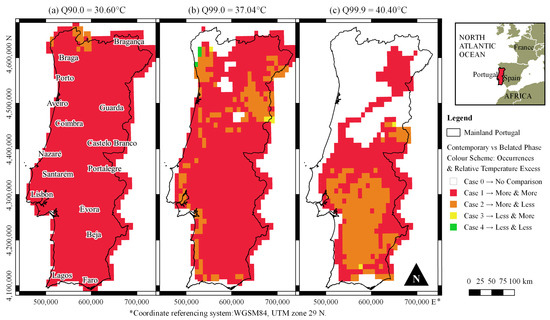 At the highest threshold, Q (Figure 10c), a dominant proportion of the centroids (44%) fell into Case 0, particularly in northern, central, and coastal regions, where insufficient data from one or both phases made the comparison impossible. For the centroids where comparison was possible, Case 1 showed up prominently, especially in the inner northern and central regions, confirming that exceptional events at this high threshold have become more frequent and intense over time. Conversely, Case 2 patterns were more prominent in the Alentejo region, suggesting that while the frequency of extreme heat events at this threshold increased, their intensity relative to the it has decreased in more recent decades.