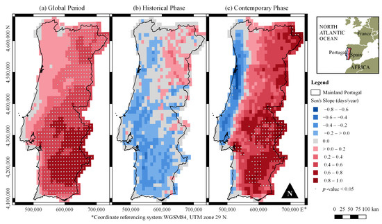 Figure 12 presents Sen’s slope estimates for RTE trends across mainland Portugal. In Figure 12a, representing the global period, most of the territory exhibits positive trends (shades of red), indicating an overall increase in temperature excess over time. The most intense warming signals (darker red shades) are concentrated in southern and central inner regions. In total, 163 centroids show statistically significant trends (p-value ), reinforcing the robustness of these findings. However, regions with unavailable data for Sen’s slope estimation (NA) are also present, particularly in areas where no occurrences of temperature excess were recorded. Figure 12b for the historical phase shows predominantly negative trends (blue shades) in central and southern inner Portugal, indicating a reduction in temperature excess during this period. Certain areas in the eastern central region and northern locations exhibit positive trends, suggesting localised warming despite the general cooling patterns elsewhere. Statistically significant results are limited during this phase, with only two centroids showing p-values below 0.05, highlighting greater uncertainty. Figure 12c depicts the contemporary phase, where strong positive trends (red shades) dominate most of mainland Portugal, indicating widespread warming. The most intense increases in temperature excess (dark red shades) are concentrated in central and southern regions, although some areas in the northwest show negative trends (blue shades), reflecting localised cooling. Statistically significant results remain limited, with only 14 scattered centroids displaying p-values below 0.05, and 92 centroids are marked as NA due to insufficient data. The presence of NA regions in all maps highlights an important limitation: Sen’s slope evaluates monotonic trends—either consistently increasing or decreasing over time—and cannot provide meaningful results for locations with irregular datasets or years without occurrences [63]. These areas are represented by white pixels on all maps.