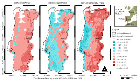 Sen’s slope estimates for trends in the Relative Temperature Excess (% excess/year) across Portugal at Q90 threshold during: (a) the global period, from 1980/1981 to 2023/2024, (b) the historical phase, from 1980/1981 to 2023/2024, and (c) the contemporary phase, from 2002/2003 to 2023/2024.