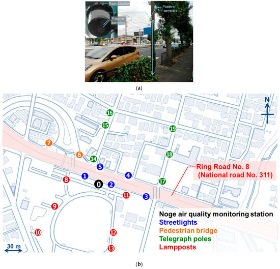 Passive samplers were placed at varying distances (0–50 m from the road boundary line) around a central observation point (N 35°36′22.60″, E 139°38′33.71″) referred to as the Noge air quality monitoring station [61], which is located beside Ring Road No. 8. The locations were selected from among at least 10 points (i.e., at least 50% of the measurement points), and were selected to ensure that the samplers could be installed at 2.5 m above the ground to be out of reach of pedestrians. Samplers were attached to streetlights along the main road, on lampposts in the park area, and on telegraph poles in the residential area, and observations were carried out. This study determined the emission factors (emission levels) from vehicle exhaust gases in a twin-site study by simultaneously measuring roadside and background CO2 and NH3. To additionally measure the background urban atmosphere not directly affected by roadside air, measurements of air pollutants taken at a general monitoring station located approximately 6 km from the roadside of this study were accessed online (measurement station code: 13112010, Setagaya air quality monitoring station, N 35°38′48.12″, E 139°39′11.42″) [63,64].