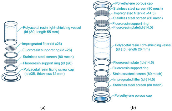 NOX was measured using a long-term passive sampler (OG-KN-S, Ogawa & Co., Ltd., Hyogo, Japan) for measuring NO2 and NOX (Figure 2b) and filter papers impregnated with reagents, triethanolamine (OG-SN-10) for NO2 and 2-phenyl-4,4,5,5-tetramethylimidazoline-3-oxide-1-oxyl (OG-SN-11) for NOX. The sampling period was one week. The extract with pure water was then colored using Salzmann’s reagent, and the absorbance at a wavelength of 545 nm was measured. The NO2 and NOX concentrations were calculated from these absorbance values using a calibration curve prepared separately and then corrected in the same way as the NH3 concentrations [43,44,45,46,47,48,49,53]. The method used to calculate NO2 and NOX atmospheric concentrations using passive sampling is described in Appendix B [65].