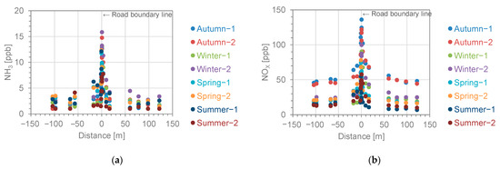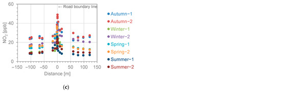 The relationship between distance from the road boundary and concentration is shown in Figure 3, combining all measurements taken at Sites 0–19 in Table 1. The results for all seasons investigated in this study show that the concentrations of NH3 and NOX decreased rapidly up to about 50 m from the road, and beyond 100 m they either remained more or less the same or decreased gradually. The ratio of the highest concentration along the road to the background concentration (Site 20, Setagaya station) shows that the concentrations decreased by 90% ± 2% for NH3, by 61% ± 9% for NO2, and by 80% ± 6% for NOX throughout all seasons.