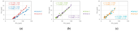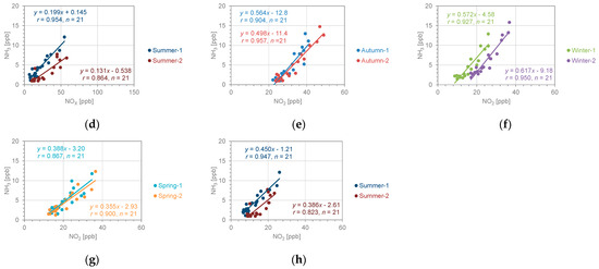 This study also found a high correlation between the increase in NH3 concentration and those of NOX (Figure 4a–d) and NO2 (Figure 4e–h) (NOX: r = 0.953 ± 0.039, NO2: r = 0.909 ± 0.046). Unexpectedly, the correlations between NOX or NO2 and NH3 were found to be weaker in the summer, and further investigation is needed to elucidate the reason for this finding. Relative to the regression lines for NH3 concentration over the entire survey period, the slope of the regression line for NOX concentration was 0.153 ± 0.024, with a relative standard deviation of 16%, and the slope of the regression line for NO2 concentration was 0.479 ± 0.024, with a relative standard deviation of 21%. As shown in Equation (1), the generation of NH3 due to the dissociation of NH4NO3 at high temperatures, such as through the pre-deposition of ammonium ion (NH4+) species together with water (dew, mist, etc.) on grassland or building walls under high relative humidity at night, is an important process that promotes evaporation in the morning [73,74]. However, in the summer, when temperatures are high, the atmosphere becomes more mixed in the vertical direction (i.e., the NH3 concentration is diluted), such that dilution in the atmosphere is thought to be greater than the formation of NH3 through the decomposition of NH4NO3 (Equation (1)), causing the NH3 concentration to decrease. In a previous study [55], the concentration of NH3 tended to be slightly higher in the winter than in the summer in an urban area of Tokyo. The scatter plots of NH3, NOX, and NO2 (Figure 4) obtained in this study show a high correlation and a slope that is generally consistent regardless of the season, indicating that the exchange of gases and particles around the roadside and the effects of evaporation from deposited ion species are within the range of variation to be expected in observations taken using passive samplers with low time-resolution measurements.