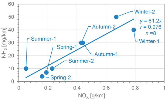 The NH3 emission factors obtained in this study were calculated based on passive sampling of NH3 and NOX, and of CO2 using low-cost sensors (see “Section 2.2. Sampling”). A comparison with NH3 emission factors based on different approaches that require expensive and diverse equipment that can focus on different targets helps to clarify the bulk emission factors from vehicles in a given area. Therefore, Table 3 compares the NH3 emission factors based on distance and fuel measured in this study, as calculated from the NH3 to CO2 conversion ratio, with the results of previous studies obtained from dynamometers, in tunnels, by remote sensing, and in on-road experiments.