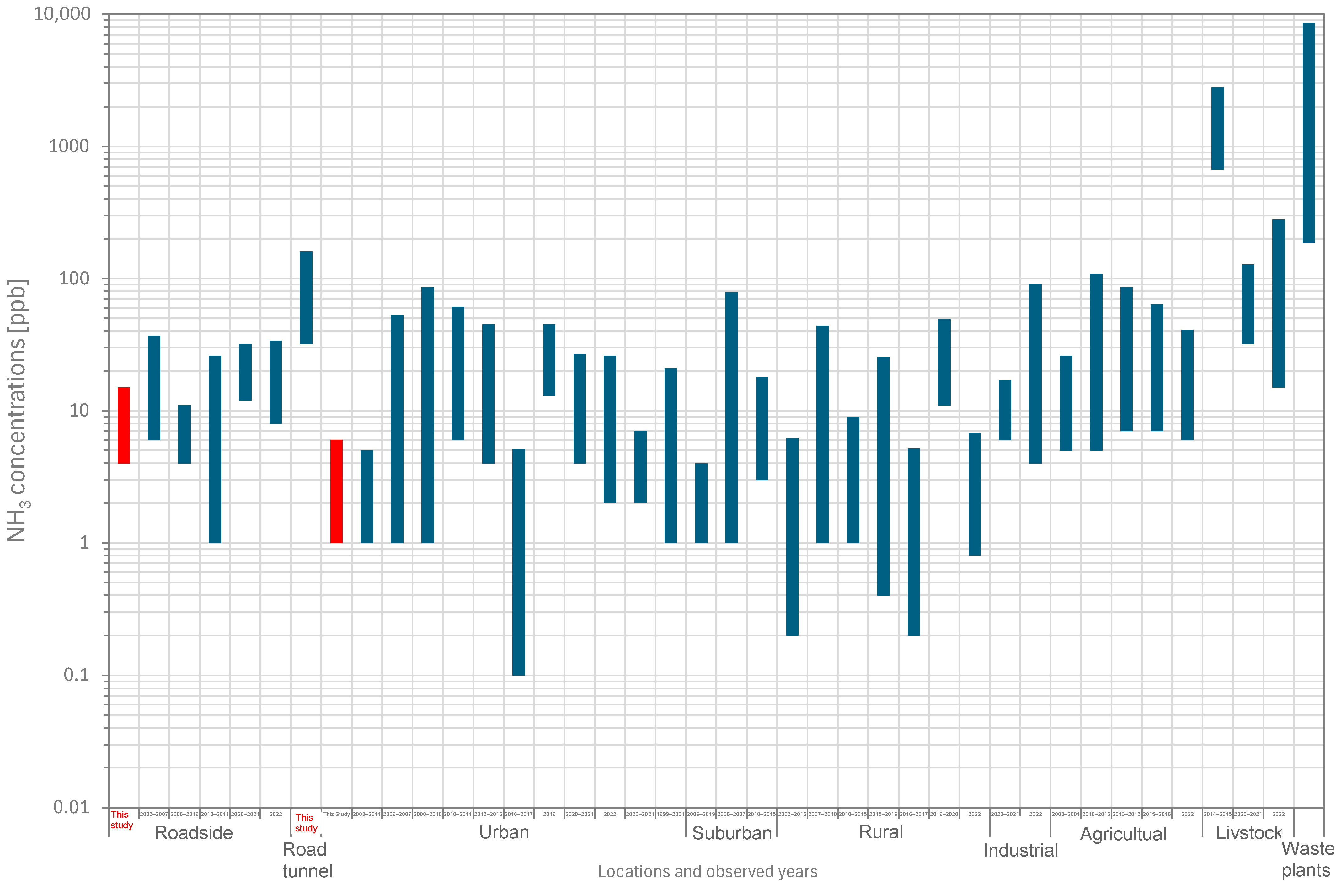 Ammonia (NH3) gas is reduced nitrogen, and it is emitted into the atmosphere from various sources, with agriculture accounting for more than 81% of the global total emissions [1]. Satellite observation data has revealed not only the variety of emissions sources but also the spatial distribution of NH3 emissions [2]. Indeed, it has been shown that the NH3 concentration in cities around the world increased by 1.2%/yr between 2008 and 2019 [3]. The potential direct impact of NH3 on the health of the general public in urban areas is not fully explained in the scientific literature, but systematic literature reviews have shown that NH3 exposure may directly result in decreased lung function, irritation of the throat and eyes, increased coughing and sputum discharge, and early onset of asthma in infants [4].